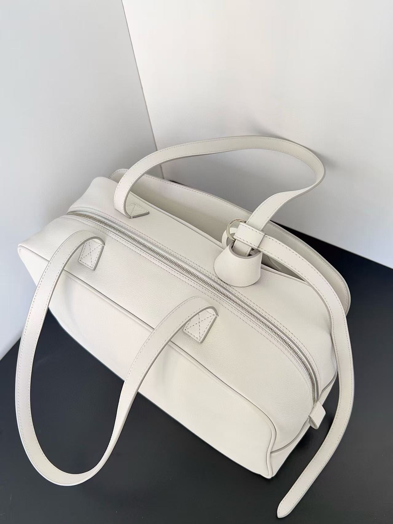• Zip closure with leather pull