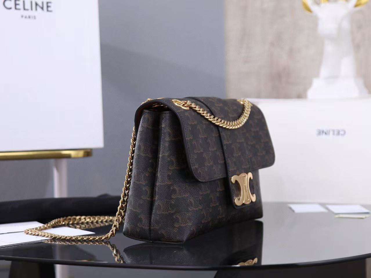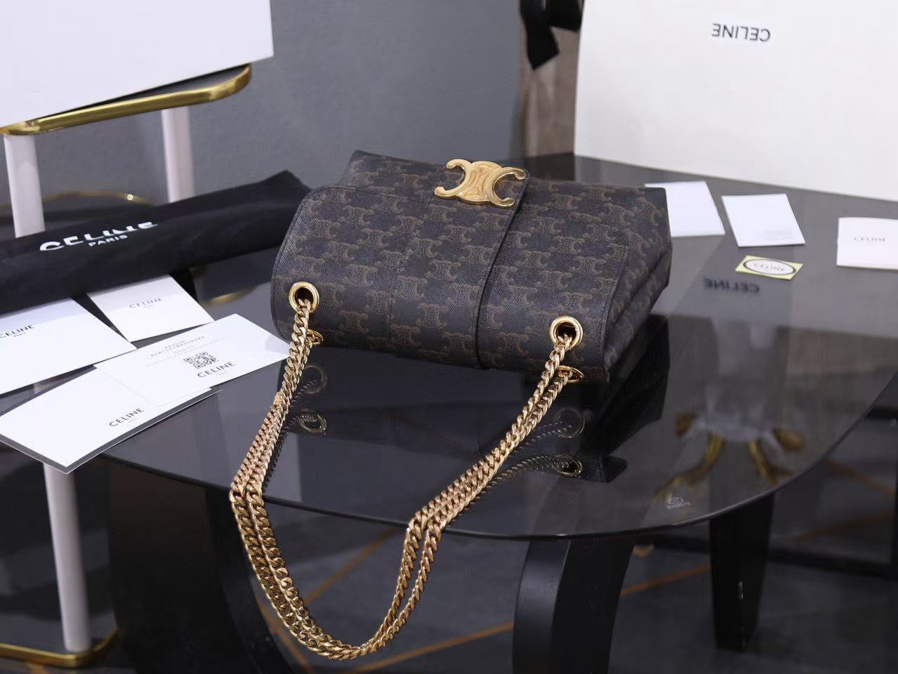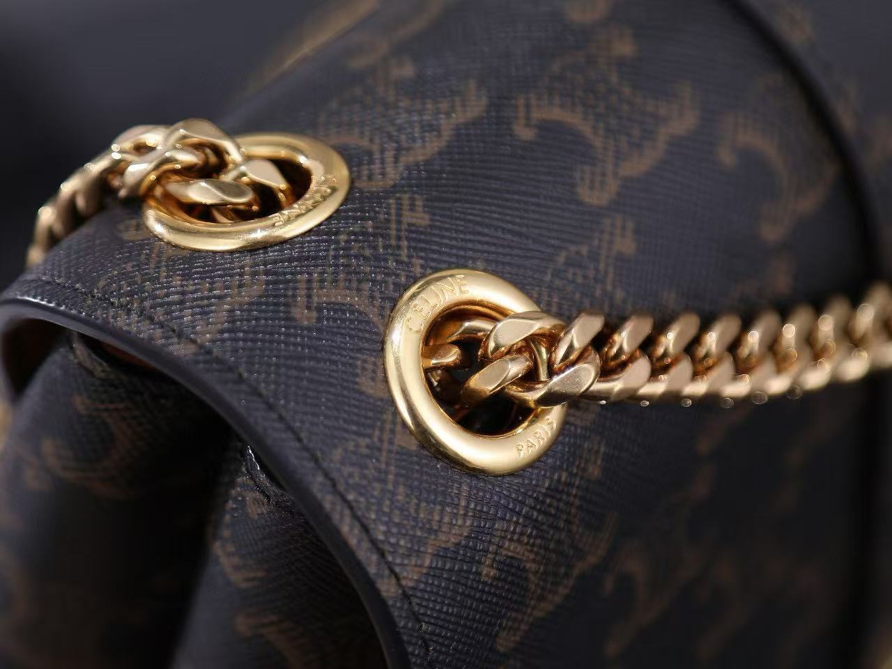 Gold finish, can be worn across the body or on the shoulder