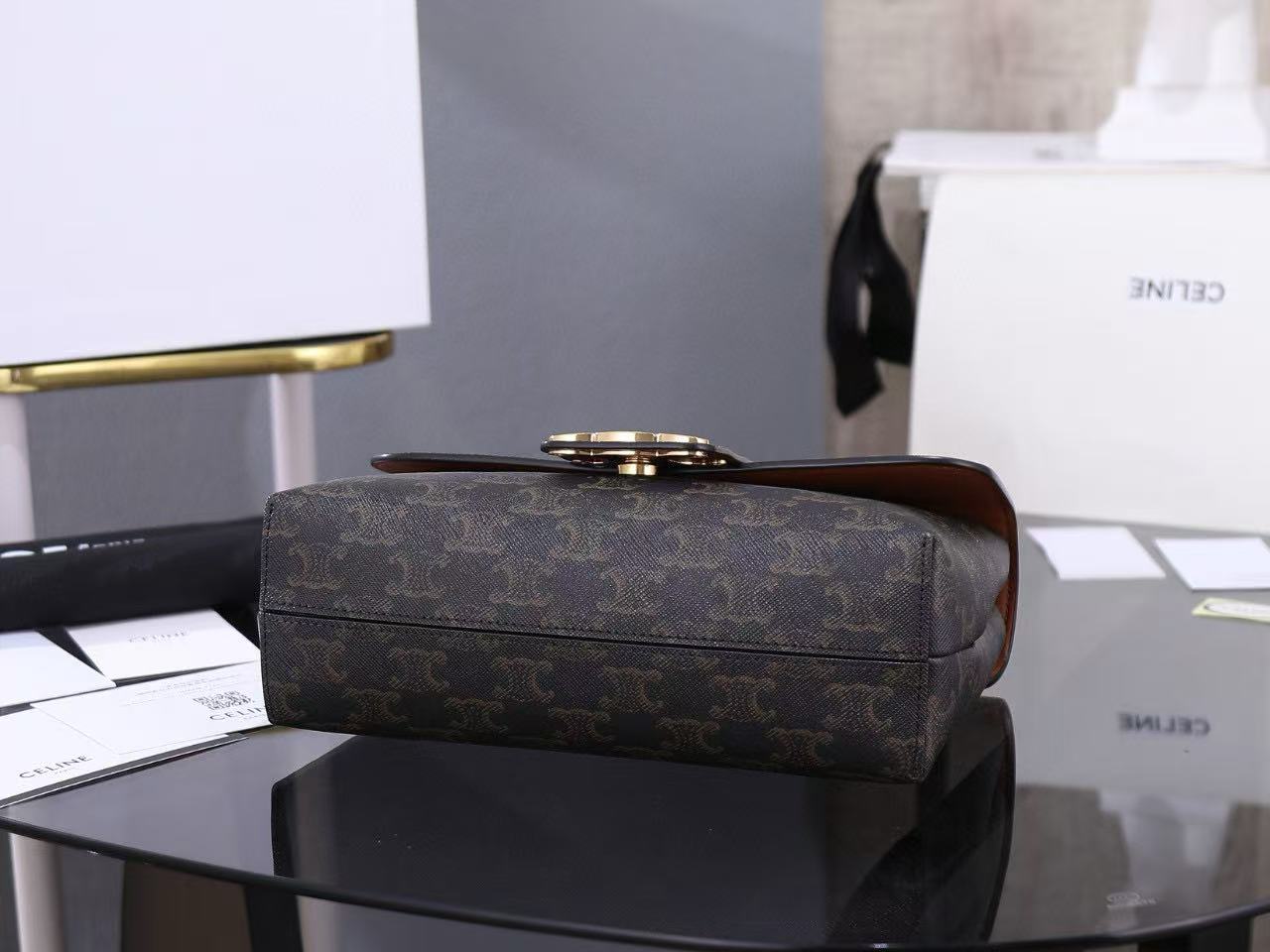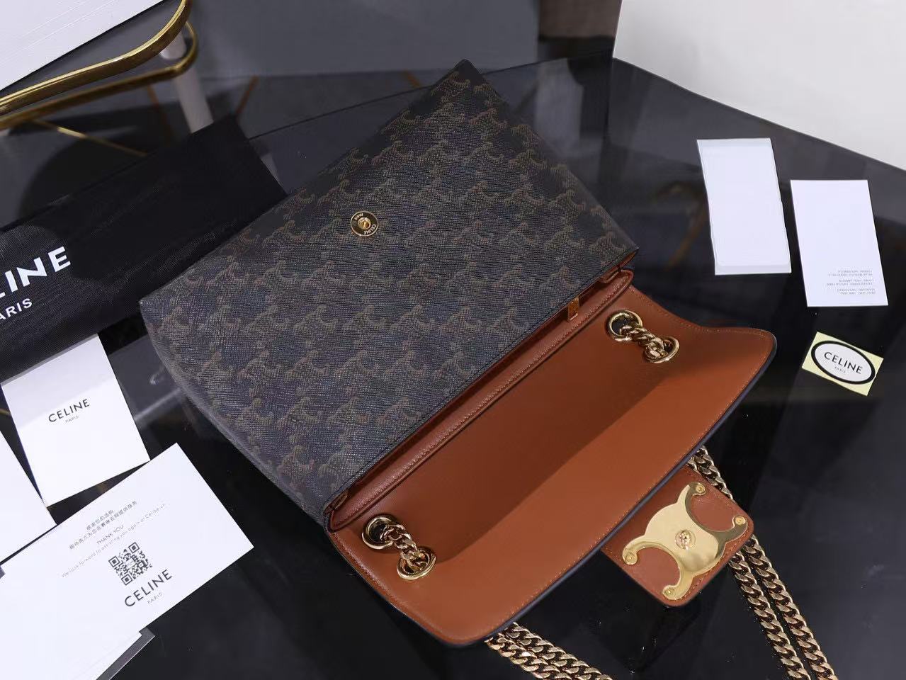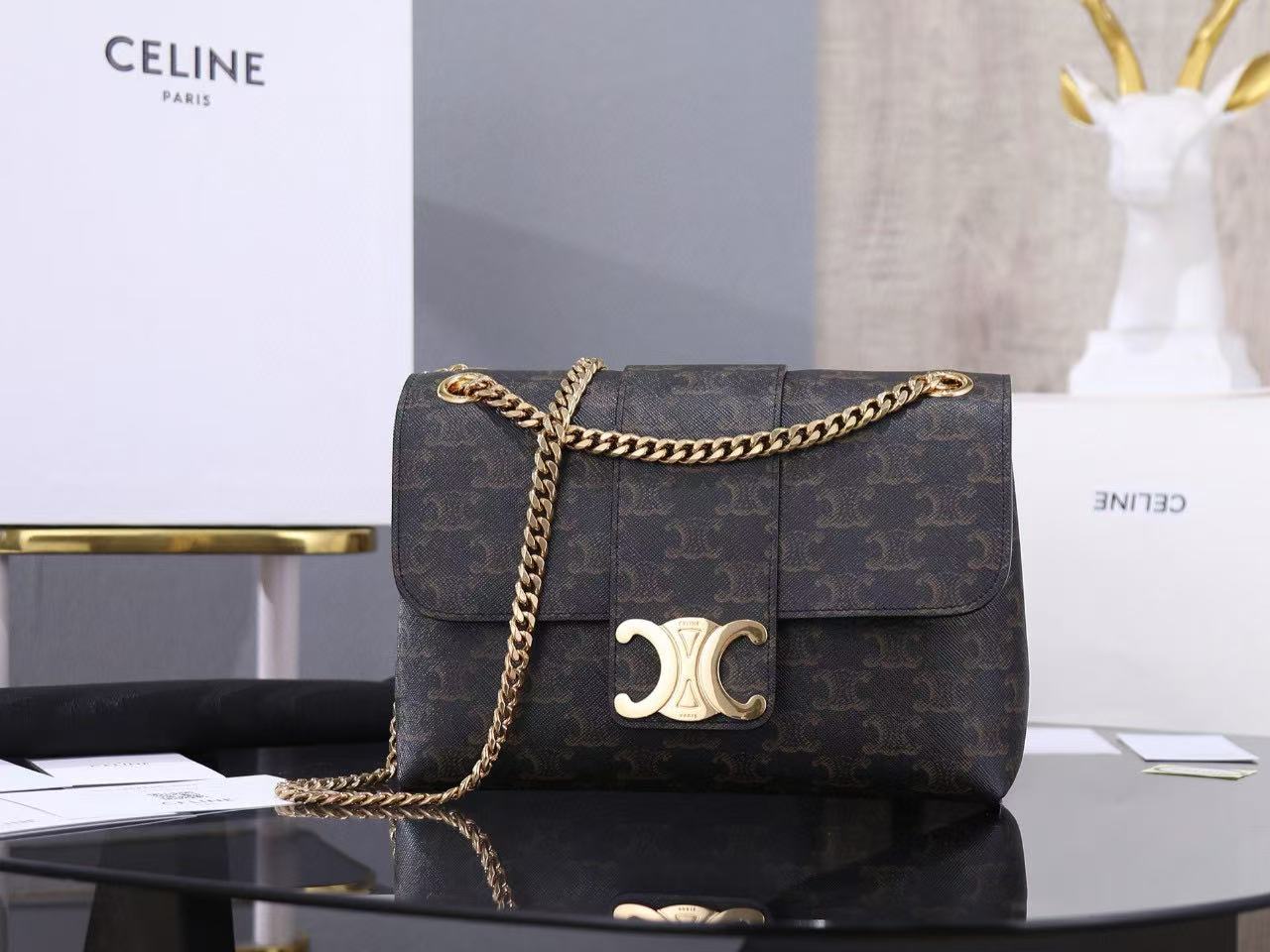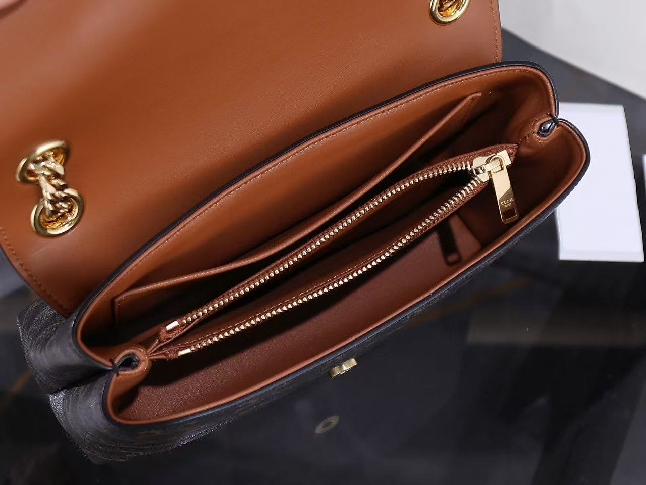 Gold finish, can be worn across the body or on the shoulder