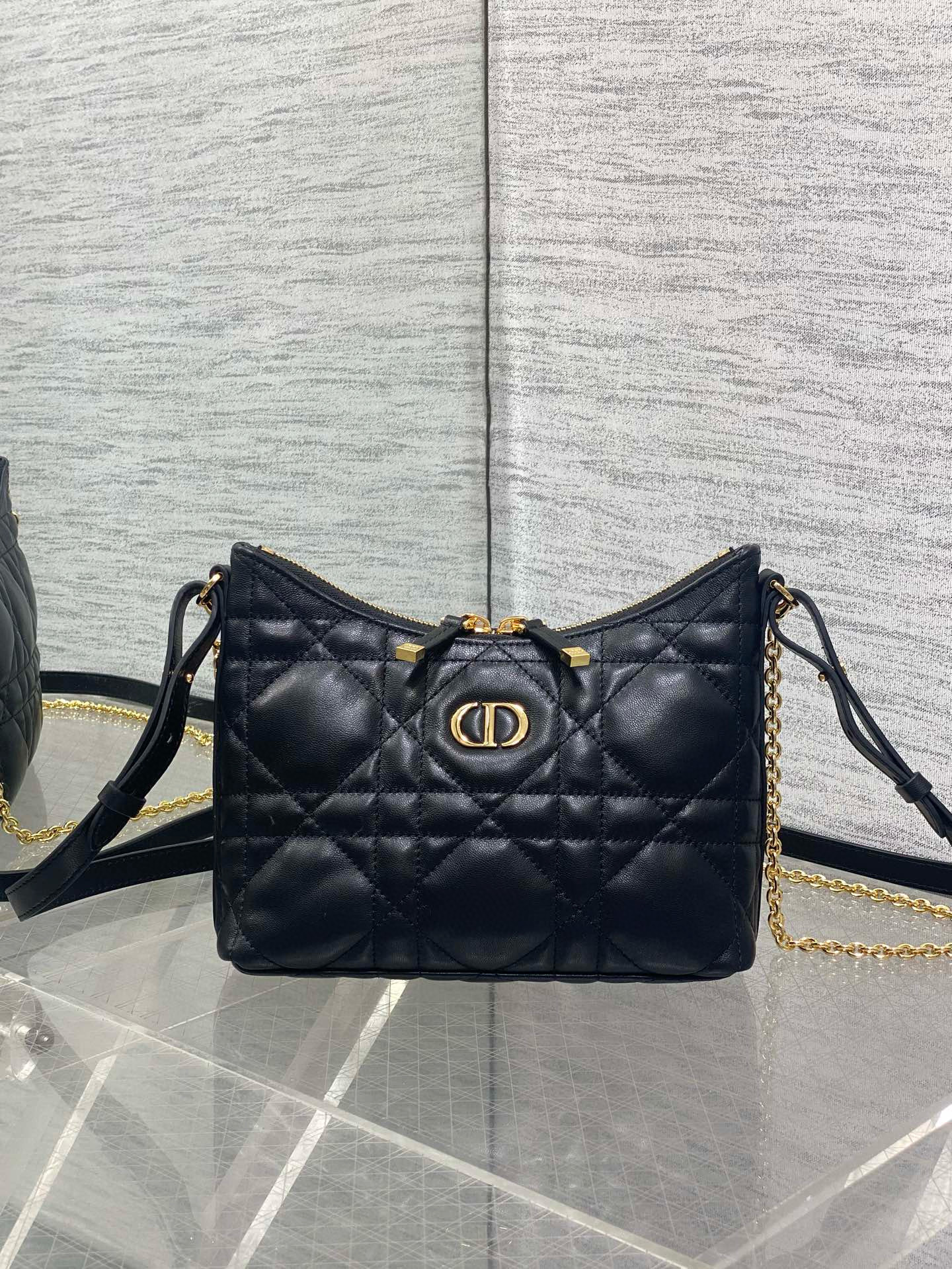 Holds a phone, a wallet, a cardholder, and lipstick